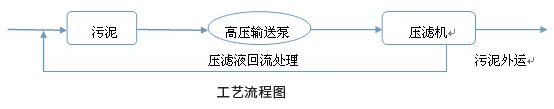 電鍍廢水處理所產(chǎn)生的污泥,直接經(jīng)過高壓輸送泵輸送至壓濾機,經(jīng)過高壓過濾壓榨脫水直接實現(xiàn)電鍍污泥高效脫水;經(jīng)過脫水污泥,污泥直接外運給有資質單位處理或重新提煉,壓濾機出水在回流至電鍍廢水處理站處理,若水質經(jīng)調制達標可直接排放。
