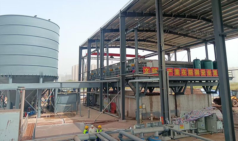 在實(shí)際處理流程中,洗砂產(chǎn)生的泥漿首先進(jìn)入泥漿收集池,隨后被泵送至深錐泥漿分離罐進(jìn)行初步沉淀分離。與此同時(shí),清水池中的清水被抽入混藥系統(tǒng)(僅針對(duì)特殊泥質(zhì)需用藥情況),與絮凝劑充分?jǐn)嚢琛;旌虾蟮乃巹?若需添加)和泥漿在濃縮罐內(nèi)反應(yīng),加速固液分離。分離出的清水通過清水泵抽送至清水池循環(huán)使用,而絮凝后的泥漿則進(jìn)入高壓壓濾機(jī)。在高壓壓濾機(jī)強(qiáng)大的壓榨力作用下,泥漿實(shí)現(xiàn)深度固液分離,壓榨產(chǎn)生的清水排出后可再次投入生產(chǎn)循環(huán),干泥餅經(jīng)傳送帶運(yùn)送至指定區(qū)域進(jìn)行后續(xù)處理。?