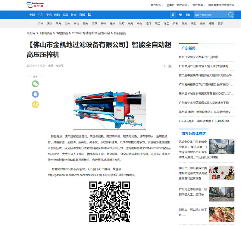 2020-11-24日南方網(wǎng)發(fā)布2020年“專精特新”新品智能全自動超高壓壓榨機(jī),金凱地過濾設(shè)備有限公司的智能全自動超高壓榨機(jī)成功入圍2020年“專精特新”新品前三名。